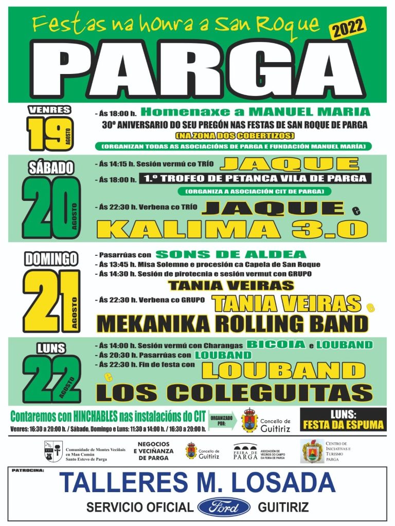 Festividad religiosa en honor a San Roque que tiene lugar en la parroquia de Parga, en el municipio de Guitiriz, donde los asistentes pueden disfrutar de los actos religiosos en honor al santo y de grandes verbenas con las mejores orquestas del momento.