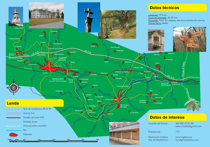 El recorrido nos lleva por el Puente y Capilla de San Alberte, Fonte da Fala, Ponte Pitero, Fonte de Valdobín, A Pobra de Parga, A Ponte de Ferreira, A Ponte de Montemeá, A Ponte de Moeiro, Balneario de Guitiriz, A Ponte da Forxá, Área recreativa y piscina de Os Sete Muíños, O Pazo y Pardiñas.