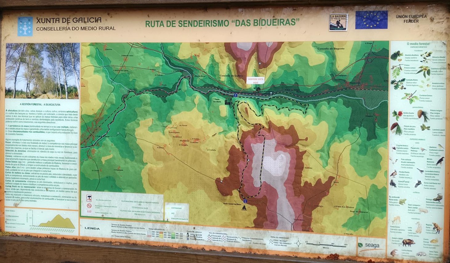 En el municipio de Guitiriz nos encontramos la Ruta das Bidueiras. Esta ruta es ideal para hacerla a finales de octubre principios de noviembre para disfrutar de los colores del otoño. El recorrido es circular de 11,8 kilómetros y de dificultad baja, ya que transcurre en su totalidad por pistas de tierra anchas por las que se puede caminar sin dificultad. La ruta está señalizada aunque es recomendable llevar GPS ya que faltan señales en algún cruce. Para llegar al punto de inicio, desde la A6, saldremos por la salida 529, y una vez en la carretera N-VI conduciremos 3 km. dirección Lugo para llegar al inicio de la ruta, situado al otro lado del río y de la vía de tren. Desde Lugo saldremos de la A-6 por la salida 522 de Baamonde, y después de otros 3 km. dirección Guitiriz llegaremos al punto de inicio a mano izquierda, teniendo sitio para aparcar a la mano derecha por una pista de asfalto. Según cruzamos el puente sobre el río Parga, de frente veremos el panel informativo de la ruta.